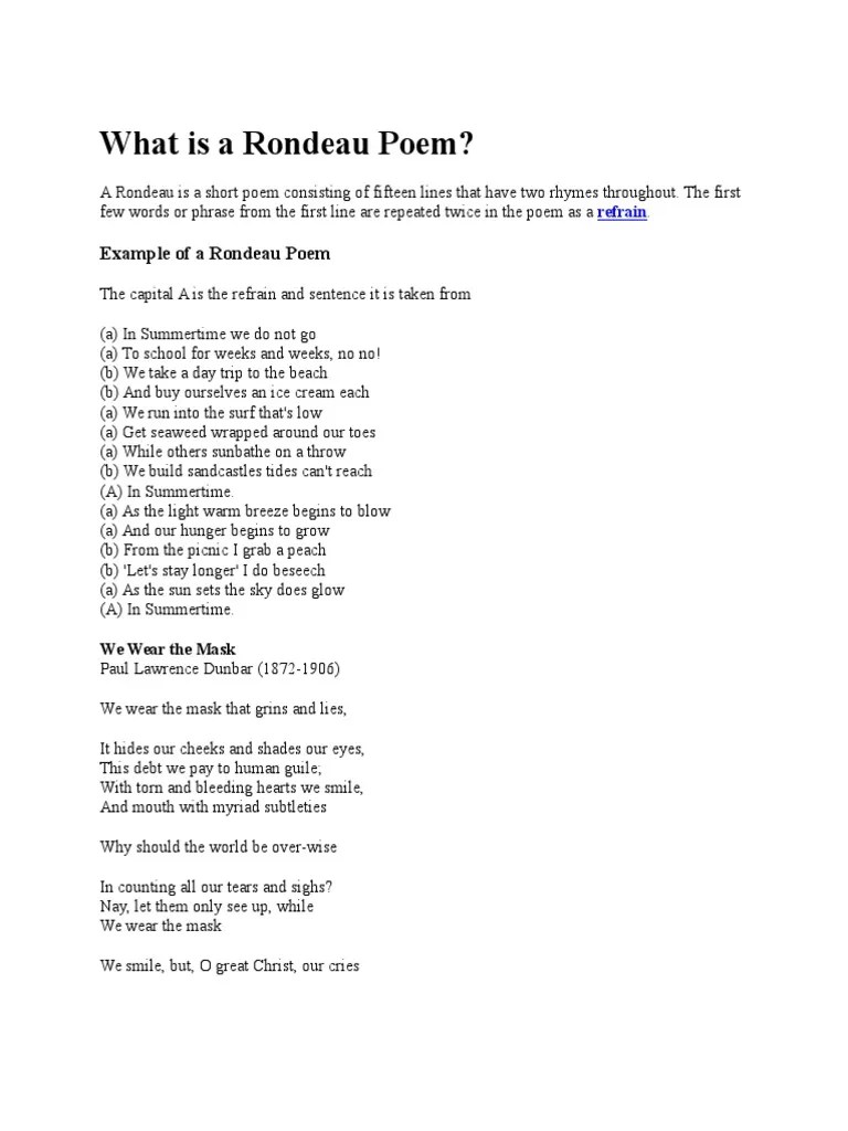 The lines are in two lengths, the main length and the refrain. Proper repeat structure for a closed form rondeau. It was invented by the 16th century french poet clément marot. See examples, origins, and features of each form and how.